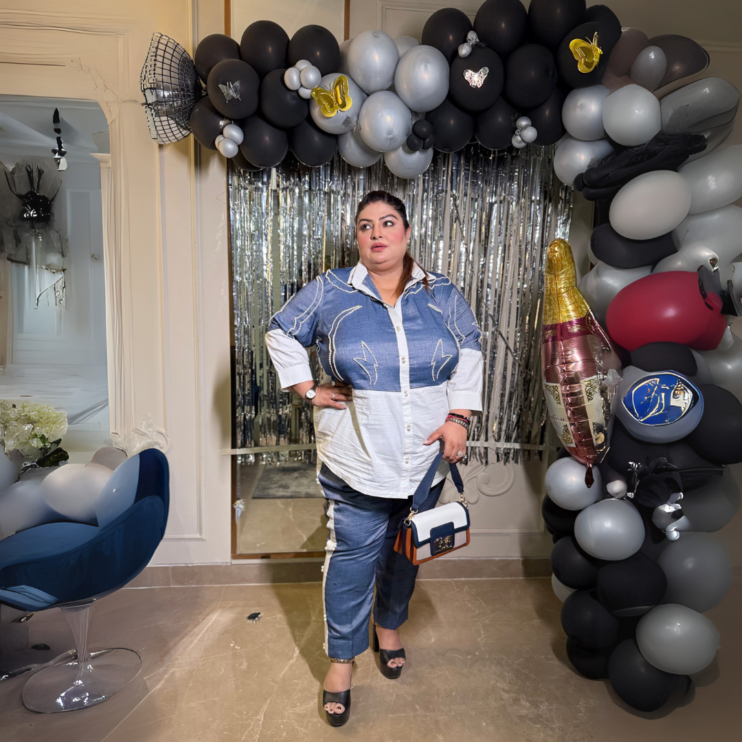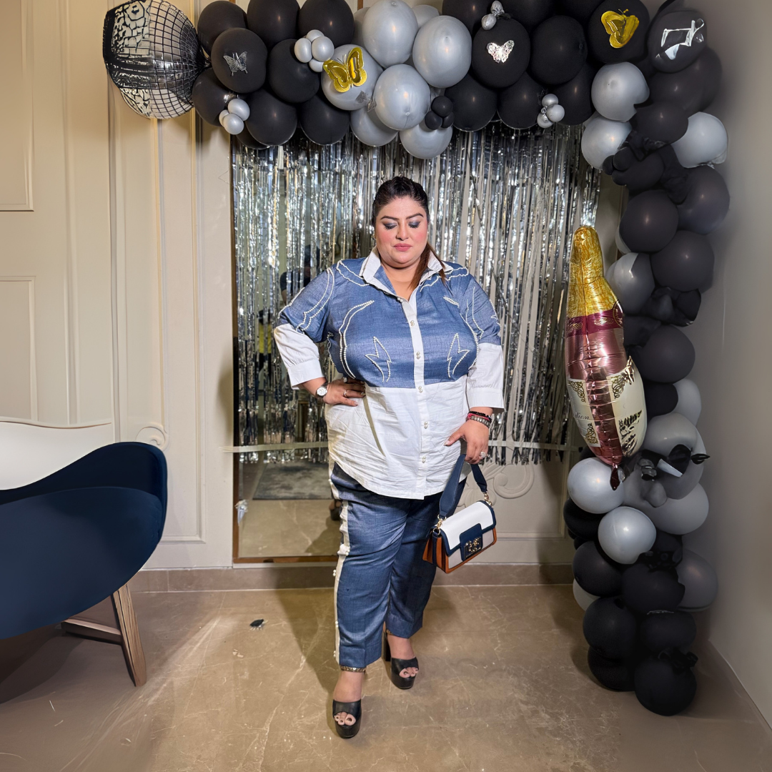This stylish set features a panelled shirt crafted from a soft cotton-denim blend, highlighted with pearl-embellished lightning motifs that add a bold twist to the classic silhouette. Paired with relaxed-fit trousers finished with delicate pearl edging, this outfit effortlessly blends comfort with statement elegance. Pearl-Embellished Motifs: Lightning-inspired accents for a bold yet feminine touch. Panelled Shirt: A flattering silhouette that adds structure and sophistication. Relaxed-Fit Trousers: Easy to wear, elegant to style. Fabric: Soft cotton and soft denim. Optional Lining: Choose with or without lining for your comfort. Available Sizes: Small (S) to 10XL. Color: Elegant Blue and White combo