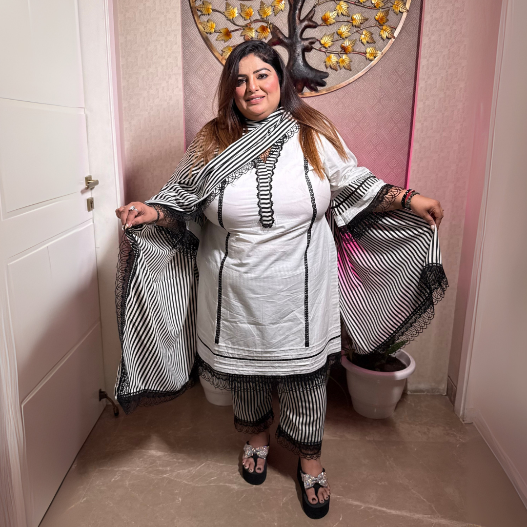 White Cotton Suit with Black Striped Georgette Dupatta – Summer Perfect (S to 10XL)